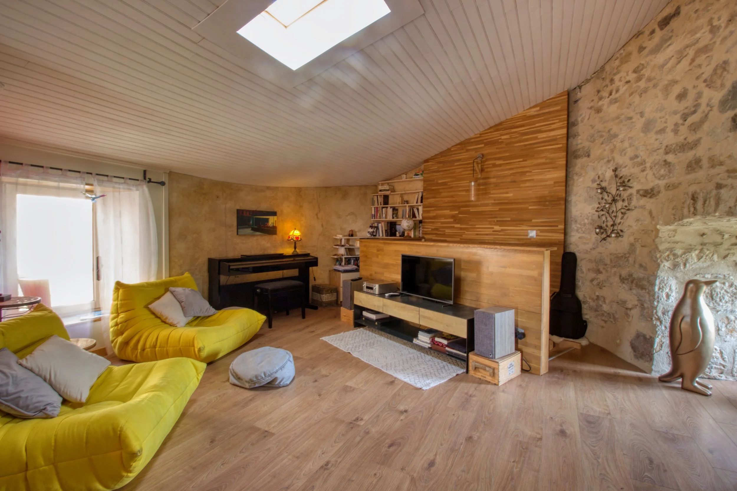 Sa forme en goutte d'eau, son agencement et son cachet avec enduit à la chaux et pierres apparentes en fait un bien très séduisant.