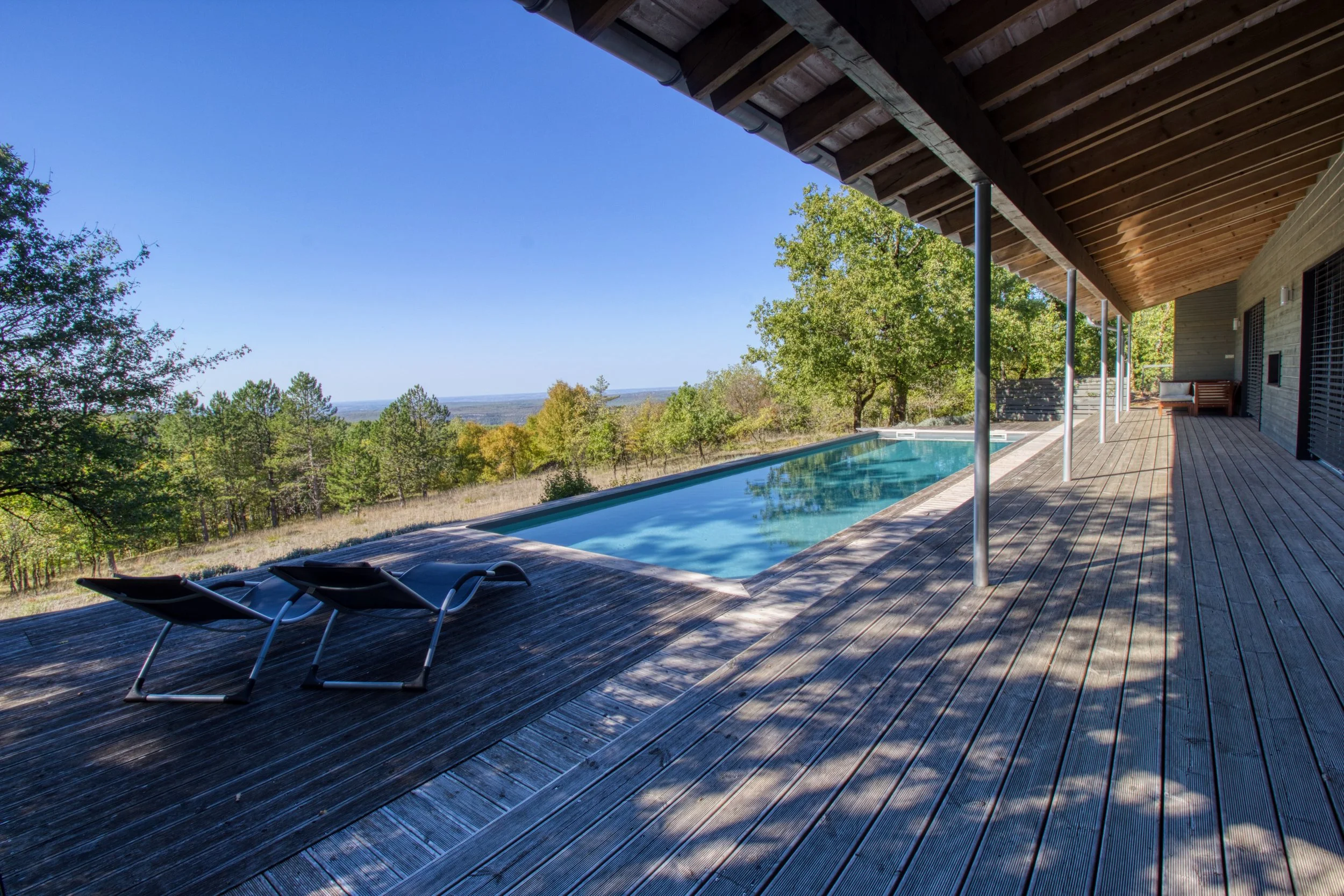 Le piscine au sel en liner anthracite de 6x13m est aussi bien un élément esthétique que de détente car on y accède par plusieurs baies vitrées.